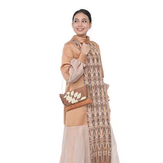 Made from kapuak bark fiber which is a typical Kalimantan local wisdom material combined with ecoprin fabric whose motifs are produced from fresh leaves. motifs are produced from fresh leaves.