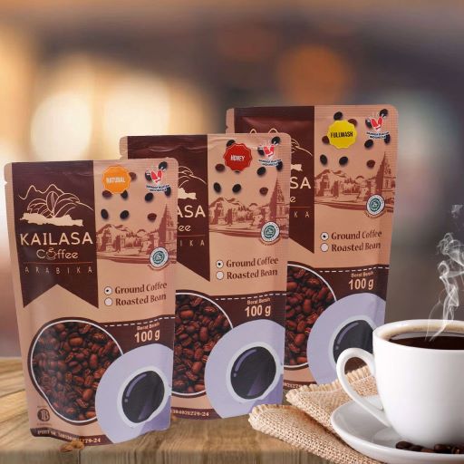 Kailasa coffee is coffee with geographical indications Arabica Coffee Dieng Mountain, Banjarnegara. Planted at an altitude of 1,200 Mdpl with a majority of varieties Lini S 795. Planting sites are located on the mountainside of the Bismo Hill, which includes the highland area of the Dieng. Processed with a variety of proper coffee beans processing, It has a distinctive scent, with a good taste, as well as variants in the processing process will create a typical Nusantara coffee. Raw materials cherry red coffee, selected premium bean, specialty coffee, fresh roast, standart profile roasting light to medium, medium to fine standart grinding, 100 % Arabica coffee, pure and natural, guaranteed, PIRT and Halal Certified, listed on DJKI.