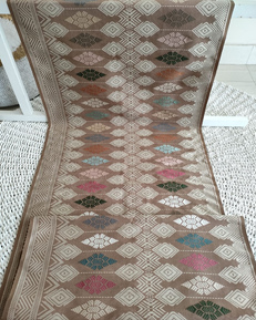 Makna Motif: Burung merak (Peacock) di berbagai belahan dunia dianggap sebagai simbol keindahan. Burung merak dianggap sebagai metafora manusia mulia, kepala/mahkotanya adalah kebajikan, sayap adalah tanggungjawab, punggung adalah perbuatan baik, dada adalah kemanusiaan, dan perut adalah sifat terpercaya. Begitu juga dalam budaya nusantara, Merak menjadi simbol keindahan kecantikan dan kebesaran. Sehingga merak seringkali menjadi motif dalam karya karya untuk menggambarkan keindahan, kebesaran, cinta kasih, atau kemuliaan. Sepasang burung merak dengan ekor menjuntai seperti “hidup” di dalam hamparan kain. Mereka bercengkrama di atas dahan mungil saling mencintai, saling menjaga, dan saling melindungi.