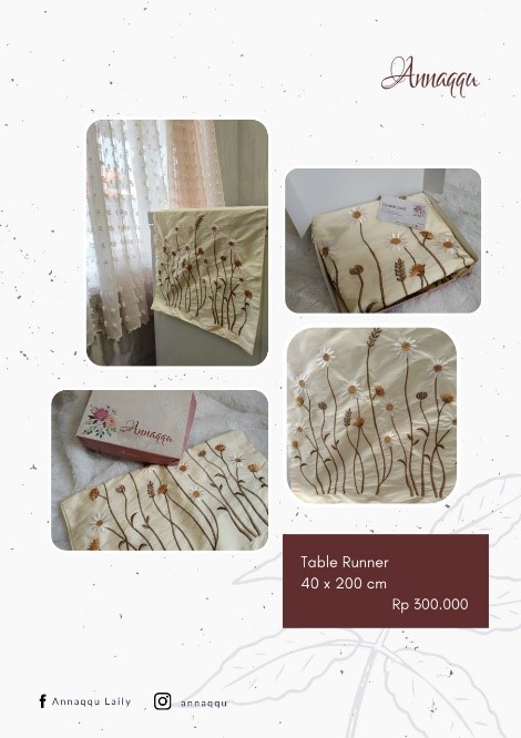 Table Runner bahan duchess/taffeta dengan bordir manual sesuai keinginan. Bordir pada 2 sisi kanan dan kiri. Bagian belakang dilapisi dengan kain hero.