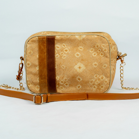 Tas ini terbuat dari Kain jumputan pewarna alam dan kulit sapi